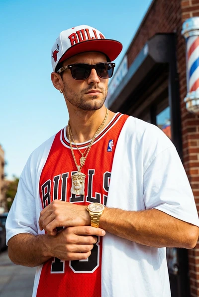 Use 100% of the attached image to create a 2000s-style male portrait. A man with a serious expression wears a red Bulls number 18 tank top with black and white details, underneath an oversized white t-shirt. He wears a white and red Bulls cap, tilted slightly to the side, small gold earrings, and two gold necklaces with large, shiny pendants—one with a stylized face studded with stones.The man is wearing dark, square-shaped sunglasses, posing with his hands fiddling with his wrist or watch and looking directly to the side with a confident expression. The photo is taken outdoors, against a clear blue sky, in New York City, near a barbershop in the 2000s. The background is out of focus.The lighting is natural, highlighting skin tones and the shine of the accessories. The colors are vivid and saturated, predominantly blue, orange, and white, with high contrast, creating a vibrant, urban feel typical of hip-hop and streetwear editorials from the 2000s.The camera angle is slightly downward (low angle), highlighting the model's posture and imposing presence. The composition is centered, focusing on the torso and face, captured in portrait (vertical) format, with high resolution (~943×768 px).The visual effect appears to have slight digital sharpening and increased saturation, reminiscent of photoshoots in rap and streetwear magazines.The result exudes timeless sophistication, opulence and GQ-level elegance.